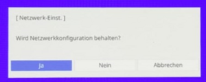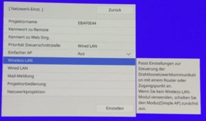Verlassen Sie das Menü mit zurück und bestätigen Sie dann die Einstellung mit „Einstellen“ (unten rechts zu finden). Die nächste Abfrage beantworten Sie bitte mit „Ja“. Der Beamer sollte jetzt mit dem WLAN verbunden sein.