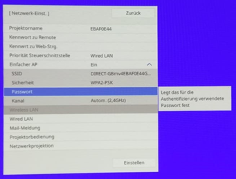 Damit ein Windows oder Android-Gerät direkt mit einem Beamer verbunden werden kann, muss der Beamer als Access Point (AP) konfiguriert sein. Dies ist standardmäßig der Fall. Sie müssen im Vorfeld nur ein WLAN-Password hinterlegen. Gehen Sie dafür bitte wie folgt vor: